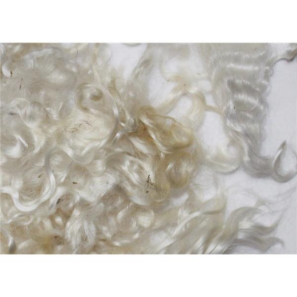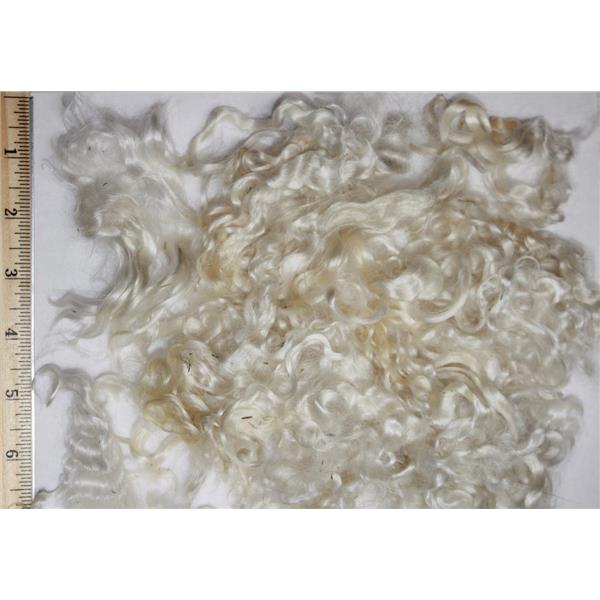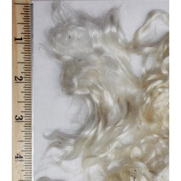 The washed white mohair curls, color is a natural creamy white may have some slightly amber tips , This is sold in one oz lots so you can buy what you need .This is a great length for doll wigs , wonderfully shiny and ready to dye into any color you need for your fairy or doll . this is washed and sorted for length the mohair has great color , Any small bits of bedding or hay will mostly fall out during proccessing and combing the fiber . ( best done after wefting or dyeing )