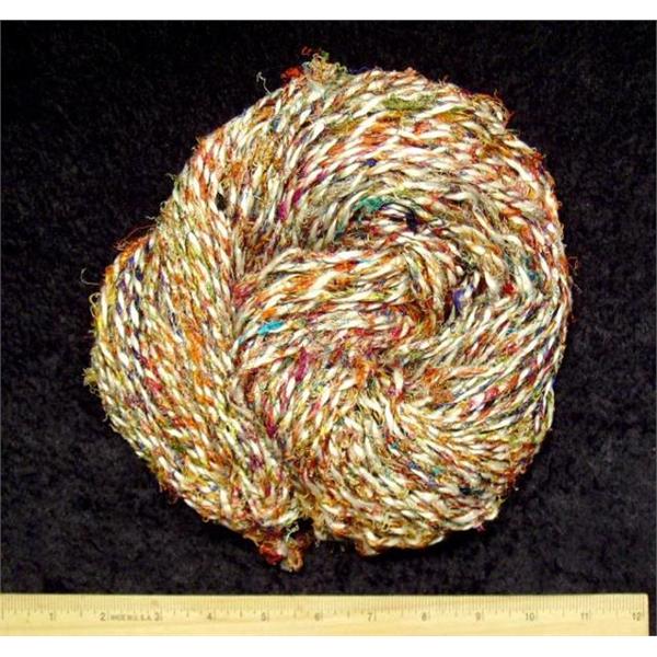 wonderful bulky yarns no 2 exactly alike . they are hand spun from the leftover threads cut from the looms of the sari factories and plied with a wonderfully drapy soft viscose rayon