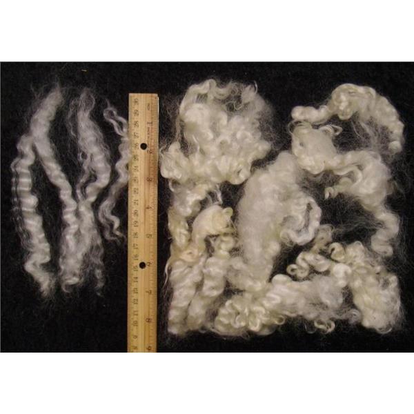The washed white mohair curls color is a natural creamy white may have some slightly tan tips , This is sold in one oz lots so you can buy what you need .This is a great length for doll wigs or santa beards , wonderfully shiny and ready to dye into ringlets in any color you need for your fairy or doll . shown as it came off the dryer this is washed but not picked, the mohair has great color , Any small bits of bedding or hay will mostly fall out during proccessing and combing the fiber . ( best done after wefting or dyeing )
