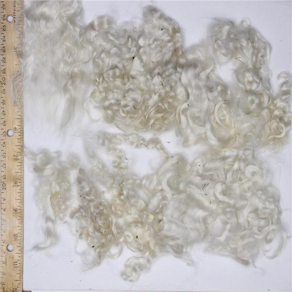 Natural white mohair locks are white but some have bits of amber at the tips this is a soft young adult mohair with a curly texture ( combed locks are not included )