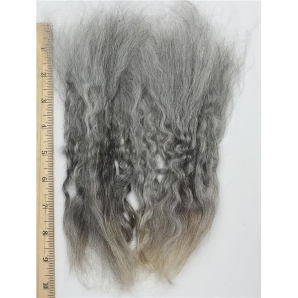 This washed lot is dark salt and pepper silver gray to black locks ( all from the same one colored angora goat ) , ready to turn into hair for your favorite doll, or spin for a warm sweater or hard-wearing rug. Working with this is a dream it is shown as it came off the dryer rack this is washed, the mohair has great color , can be over dyed for darker color will take darker blonds through browns very well . It is a nice lot as far as vegetable matter there is some as this was not a coated animal But there is really very little. The scant small bits of bedding or hay will mostly fall out during processing the fiber .