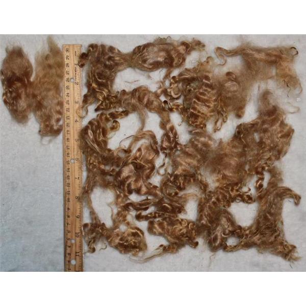 1 oz ( = 28.35g ) of dyed mohair curls Bright strawberry blonde , very soft Yearling mohair