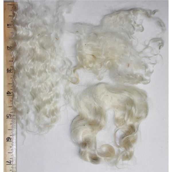 The washed white mohair curls color is a natural creamy white may have some slightly amber tips , This is sold in one oz lots so you can buy what you need .This is a great length for doll wigs , wonderfully shiny and ready to dye into ringlets in any color you need for your fairy or doll . shown as it came off the dryer this is washed but not picked, the mohair has great color , Any small bits of bedding or hay will mostly fall out during proccessing and combing the fiber . ( best done after wefting or dyeing )