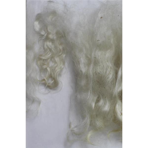 The washed white mohair curls color is a natural creamy white may have some slightly amber tips , This is sold in one oz lots so you can buy what you need .This is a great length for doll wigs , wonderfully shiny and ready to dye into ringlets in any color you need for your fairy or doll . shown as it came off the dryer this is washed but not picked, the mohair has great color , Any small bits of bedding or hay will mostly fall out during proccessing and combing the fiber . ( best done after wefting or dyeing )