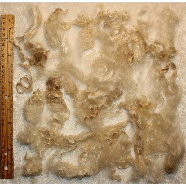 The washed white mohair curls color is a natural creamy white may have some slightly tan tips , This is sold in one oz lots so you can buy what you need .This is a great length for doll wigs , wonderfully shiny and ready to dye into ringlets in any color you need for your fairy or doll . shown as it came off the dryer this is washed but not picked, the mohair has great color , Any small bits of bedding or hay will mostly fall out during proccessing and combing the fiber . ( best done after wefting or dyeing )