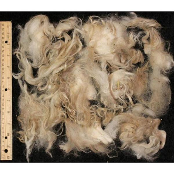 color is white this has a fine adult texture that combs out to wonderful loose waves , It is doe fleece This is wonderfully silky and shiny ready to wash and turn into hair for your favorite doll or spin for a warm sweater or a drapy silky shawl . Working with this is a dream it is shown just a few locks lined up to show the texture and is sold bulk and will arrive unsorted this is not yet washed but has been picked over to remove any heavy debris .. as far as vegetable matter there is some as pictured as this was not a coated animal and it is a bulk lot , it has been skirted to remove all manure but there is some small amounts bedding and hay That is a disclaimer just in case !), ( Goats will be goats ) .The small bits of bedding or hay will mostly fall out during processing the fiber