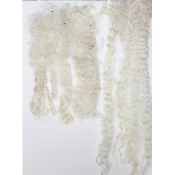 color is a natural white some hay and dirt and sawdust partially combed lock to show this falls out in preparation ,