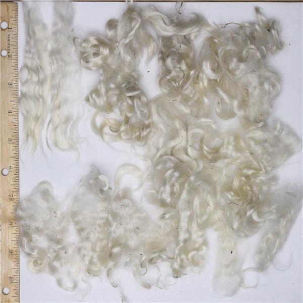 Natural white mohair locks are white but some have bits of amber at the tips this is a soft young adult mohair with a curly texture ( combed locks are not included )